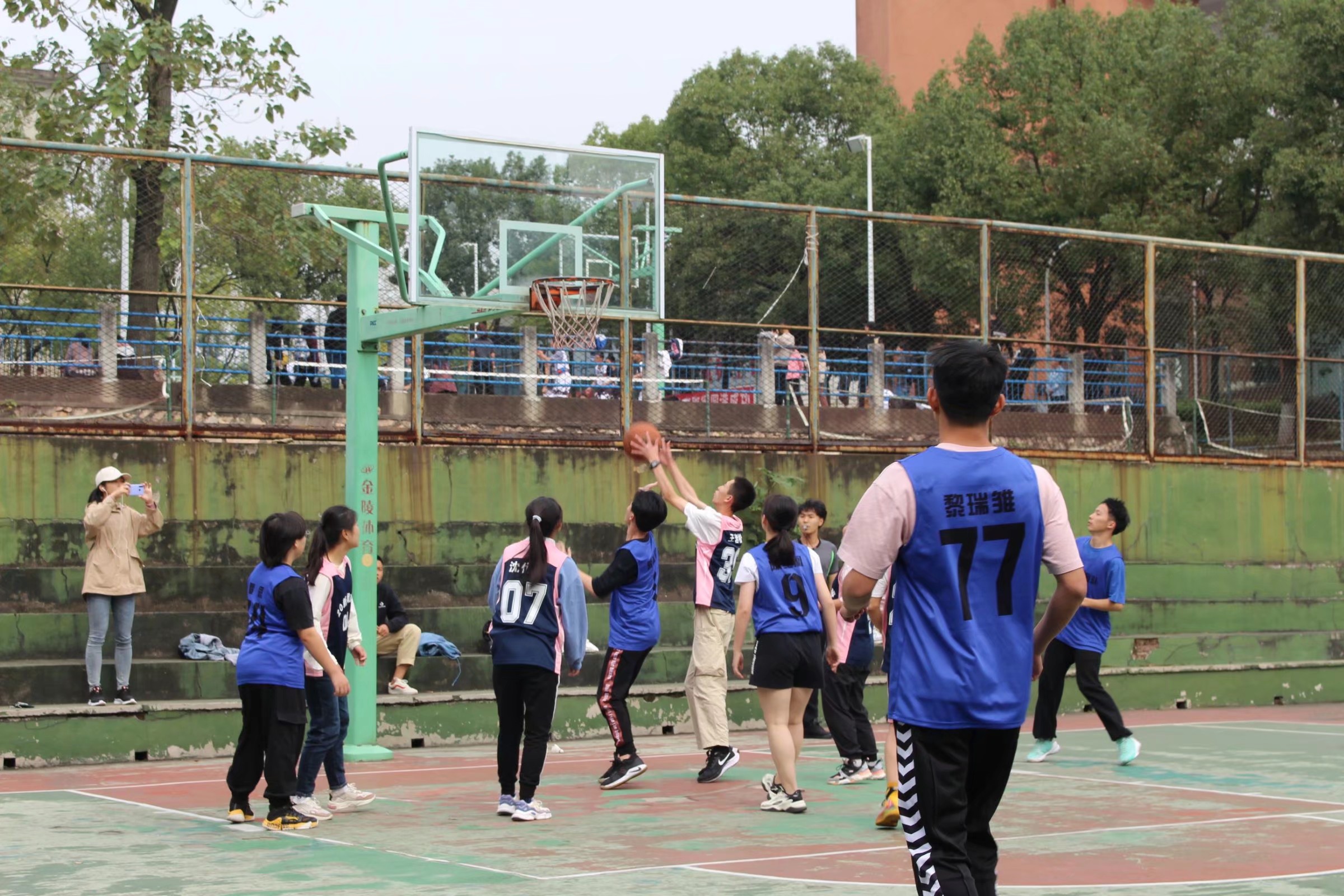 秋风阵阵,第一回合哨声吹响,气氛立刻紧张起来,19新闻联队77号黎瑞雏与20新闻三班28号夏国梁同时腾空而跃,伸手、勾腕、拍球,77号黎瑞雏成功抢得首球,抱球转身,准备传给9号女将陈纪凰,9号顺利接球投篮,首球得分。新闻三班的球员们也在篮筐下迅速散开,准备拦截,18号刘瑶成功截下篮球,立即传给39号王岩松,王岩松快速接球,稍作片刻便投向篮筐,一举拿下本场比赛的首次三分球。19新闻联队1号蒋嘉祺突破重重围阻抢下篮球,瞄筐,抬臂,进篮!19新闻联队配合默契,相得益彰,20新闻三班也不甘示弱,紧追其后。第一回合结束,19新闻联队以28:15的分数稍微领先。