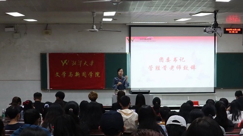 团委书记管胜昔老师作开场致辞。她首先向加入第二十届文新院学生会的新成员表示祝贺,而后向大家提出几点建议:一是处理好个人与集体的关系,谨记学生身份,将学业放在首位,同时处理好自己的本职工作,不断提升自己;二是处理好分工与合作的关系,注意部门内和部门之间的分工,同时注意多方合作与沟通,更好地完成学生会工作;三是处理好传承与创新之间的关系,在高度肯定以往学生会工作的同时对新一届学生会全体成员提出了更高的期望。