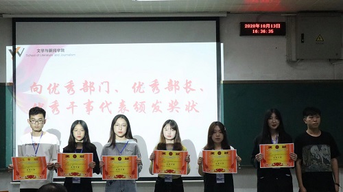 第二十届学生会主席团、部长颁发聘书并合影留念。接着,学生会各部门负责人通过PPT演讲等方式逐一介绍各部门的概况。第二十届学生会团委第一副书记赵子杰带领第二十届学生会全体成员宣誓,“打造魅力团队,展现文新风采”是我们矢志不渝的追求,“文新文新,文艺双馨”是我们永恒的风采,“文以载道,薪火相传”是我们肩负的责任。第二十届学生会主席蔡雨婷发言,从四个方面系统地提出工作要领,并对全体成员提出期望。