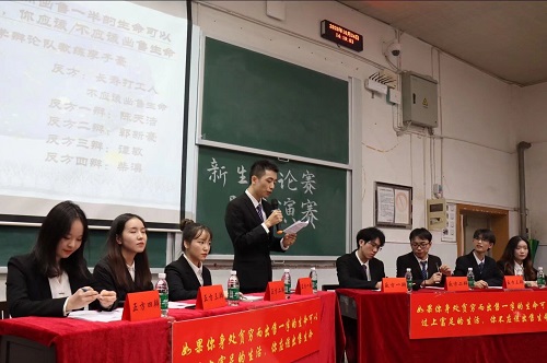 辩是非,逞口舌之利;论长短,看知识我丰。本次辩论赛以“如果你身处贫穷而出售一半的生命可以过上富足的生活,你是否应该出售生命”为辩题,正方“短命富豪团”的观点为应该出售生命,辩手分别是一辩袁炜铭、二辩刘雨溪、三辩杨萌、四辩康兰明慧。反方“长寿打工人”的观点为不应该出售生命,辩手分别是一辩陈天浩、二辩郭新豪、三辩谭敏、四辩柴澳。