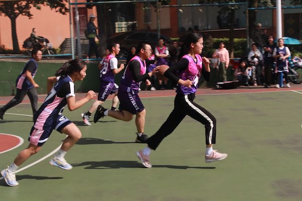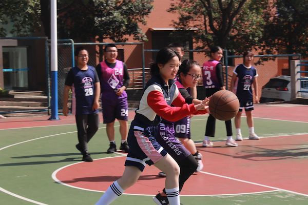 比赛开始了!随着裁判一声哨响,篮球被高高抛起,场上的氛围瞬间紧张起来。双方你来我往之时,19新闻二班3号球员郭紫玥率先夺球,她身手敏捷地穿过对手的重重防线,顺利投进一球,为19新闻二班取得开门红。随后,19中文二班97号球员沈彦洲带球过人,潇洒的英姿引起场下阵阵惊呼,可寡不敌众,19新闻二班47号球员吴昊男与3号球员郭紫玥默契配合,在队友的帮助下连进4球。至此,第一场比赛新闻二班以20:0的优势暂时领先。