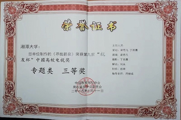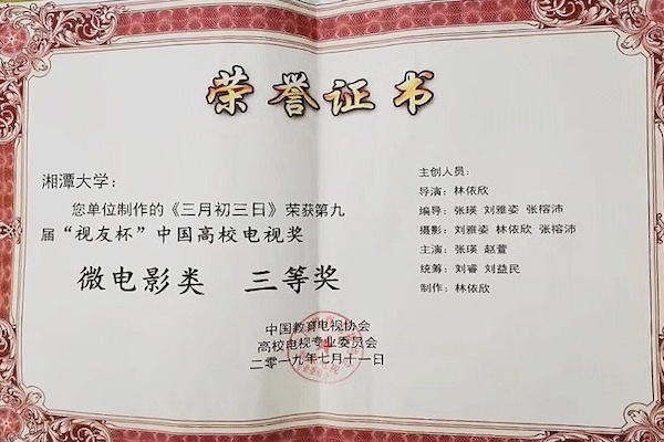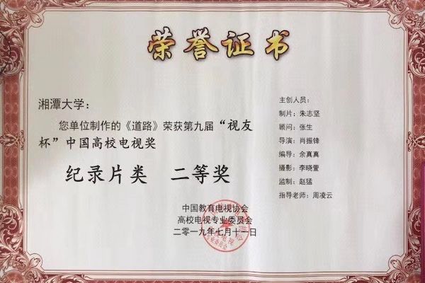 选送的三部作品分别斩获二等奖1项,三等奖2项。其中,由院党委书记赵猛监制,周凌云、华进老师指导,肖振锋等人创作的作品《道路》荣获纪录片类二等奖;由赵猛老师指导,林依欣等人创作的作品《三月初三日》荣获微电影类三等奖;由符继成老师指导,梁思凡等人创作的作品《寻找碧泉》,荣获专题类三等奖。