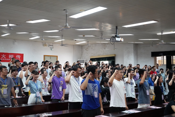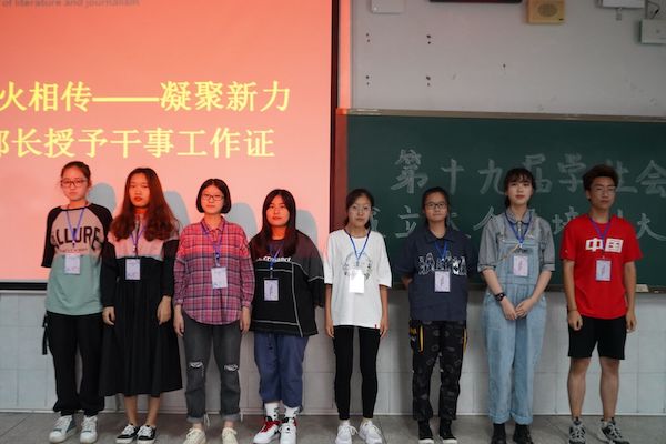学生会各部门负责人通过ppt讲演等方式逐一介绍本部门主要工作任务、工作特点、上一年度工作开展情况及部门成员等概况。随后,第十九届学生会各部门部长授予干事代表工作证,第十九届学生会全员在学生会主席罗舒晴的带领下庄严宣誓,在“博学笃行,盛德日新”的校训激励下;在“文以载道,薪火相传”的使命传递中,新一届学生干部立志以服务同学为己任,以身作则,公正无私,为把学生会建设成一个高效、团结、和谐的集体而奋斗。
