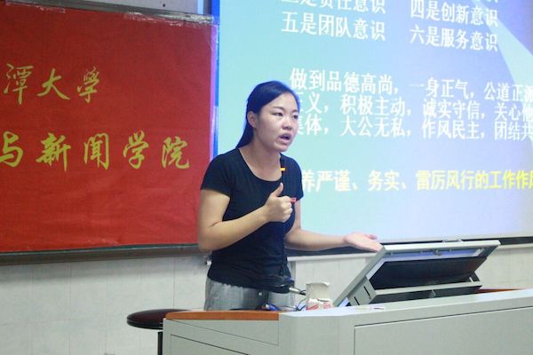 团委书记管胜昔老师对学生会干部进行培训。管老师以 “立志、善思、力行——一名合格学生干部的自我成长之路”为题,勉励学生要求学生干部一是要立志:树立目标、科学规划;二是要善思:理清思路、积极创新;三是要力行:执行有力、注重效率。并通过现场问答互动等方式指出学生应具备:政治意识、大局意识、底线意识、责任意识、创新意识、团队意识、服务意识、程序意识等“八个意识”。管胜昔提出学生干部要切实充当起师生之间沟通的桥梁与纽带作用,发挥先锋模范作用。在提倡勤勉实干、调查研究的同时,要结合学院专业特色,将学生活动的举办融入学院人才培养体系的大格局中,注重创新、突出特色、打造品牌。