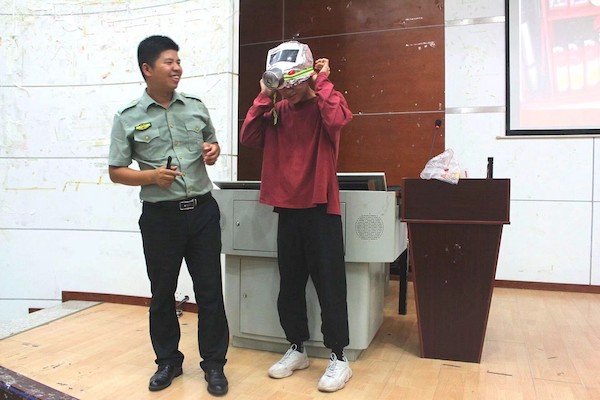 湖南省普消消防教官李进军进行消防安全知识讲座。由于近年来火灾形势不断严峻,造成人财损失惨重,李教官首先向同学们普及引起火灾事故的最主要原因是人为因素,并以火灾事件为例,让同学们深刻认识到学习消防安全知识的重要意义。接着李教官为同学们讲述了身临火场的正确逃生方法,并通过现场互动的方式向同学们展示了防毒面具佩戴法和手电筒求助逃生法,有效地帮助同学们更好掌握消防安全知识。