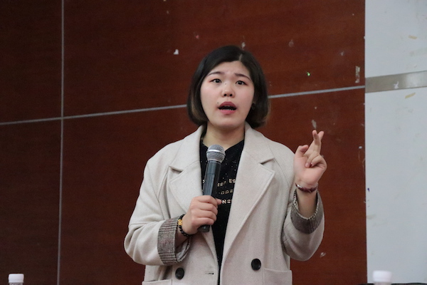 最后,由考研、保研学生代表发言。首先是保研学生代表,来自2015级广告二班的令清漪同学,已经保研至兰州大学传播学专业。她向在座的同学们介绍了自己的保研历程,从准备方面的扎实知识基础、学校选择、注意事项等到夏令营、预报名等阶段进行了详细的讲述,为意向保研的同学扫掉了一些雷区,让他们对保研有了更加清晰的认识。随后来自2015级广播电视学二班的张静同学发言,已经报考了中国传媒大学研究生的她热情地分享了自己的考研经验及准备工作。张静同学主要从“为什么考研”“该考哪所学校”“如何备考”三个方面展开讲述,告诫意向考研的同学们要看清毕业季的大潮,分析不同选择可能带来的影响,平衡好理性和感性的冲动,并要有从一而终的坚持和努力。“选择之后就全力以赴”,她鼓励在座的同学们向着自己的目标不断前进,并祝愿他们最终都能如愿以偿,有光明的前程。两位学姐的话慷慨真切,让在座的同学们都获益匪浅,坚定和增强了自己的考研信心。