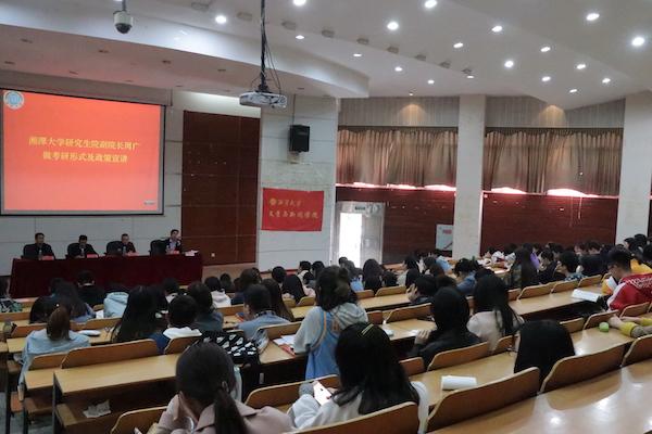 随后,由研究生院副院长周广为同学们做考研形势和政策宣讲。他从三个方面给大家提出了建议:一是信息搜集,大家应该重视考研前的信息搜集工作,提前了解考研现状、拟报考学校的相关信息。二是确定目标。他建议大家根据相关信息以及自身情况来确定目标,多角度考虑问题。三是心态的调整,注意学习方法、关注时事,并且劳逸结合,抵制诱惑,充满信心,认真准备。