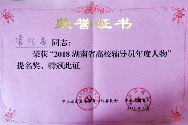 辅导员管胜昔获评2018湖南省高校辅导员年度人物提名奖。