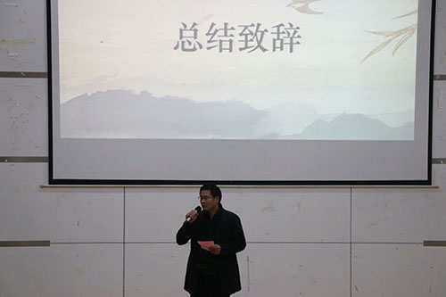 在八个班级展示完毕后,由周鹏飞老师致结束辞。周老师对同学们的辛苦表演给予了高度的肯定与评价,并大力赞扬了各班班级文化建设的相关工作。最后,周老师还提出了对文新学子的期望,那就是希望每位新生都能收获一段美好的大学生活。一时间,掌声如鸣。