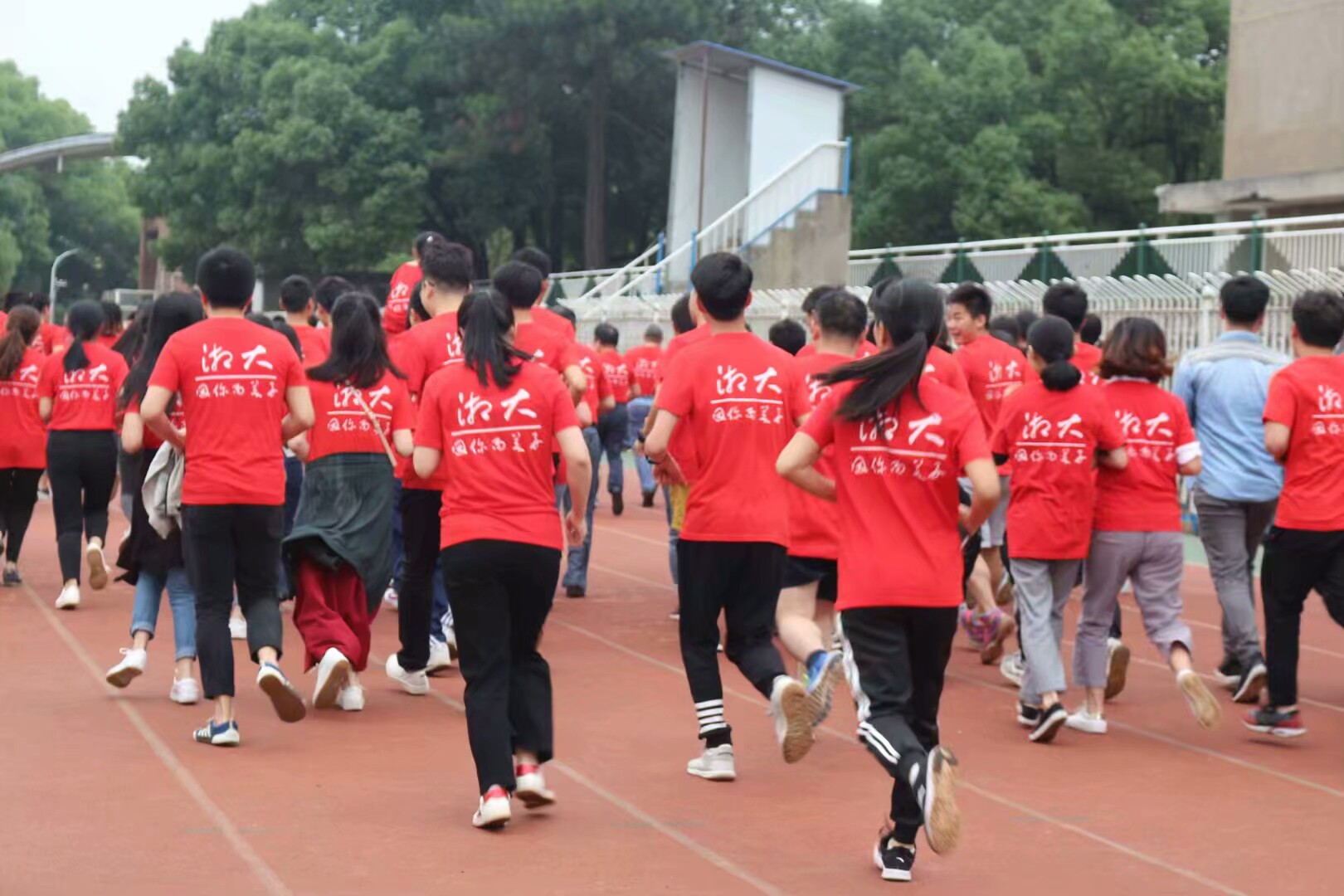 随着校长周益春教授的鸣枪发令。校友方阵、教职工方阵、学生方阵依次起跑,挥手高呼着以表对湘大的祝福。