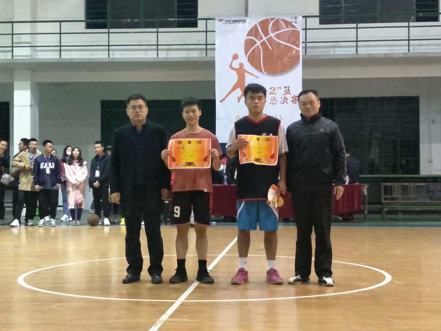 团委第一副书记贺纯、团委第二副书记李欣珂、主席徐季、副主席仲娴、副主席张云开、副主席韩宸旭。历时一个月的比拼,在经历了38场比赛后,我们终于迎来了激动人心的决赛。今晚由15广电和16广告进行冠亚军的争夺。篮球队员们在赛场上尽显拼搏精神,迸发出了蓬勃的朝气与力量!