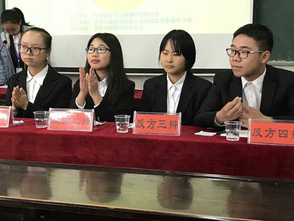 接下来是令人期待的自由辩论环节,此环节双方辩手轮流回答并互相询问。正反双方辩友质询快速而激烈,回答简洁有力。双方提出问题的一针见血,回答也露不出丝毫破绽。两方据理力争,快节奏的答辩,让场外观众热血沸腾。