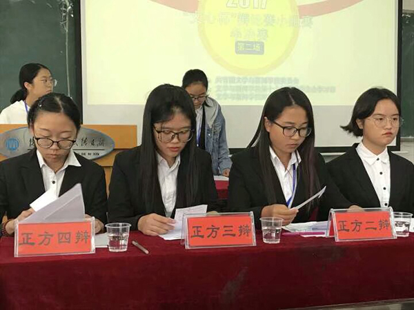接下来是质询环节。反方四辩金宸亦对正方一辩李红阳进行质询,从微博意见领袖个人的处事价值观进行询问,反证微博意见领袖的意见会过度引导群众的判断能力,剪弱民众的认知水平。但中文三班的辩手也不甘示弱,正方四辩章卓对反方一辩进行质询,以民众点赞和转发微博意见领袖的行为,是民众经过思考后进行的为观点,对反方二辩进行辩驳。双方辩手各有自己合理的观点,场下喝彩阵阵。