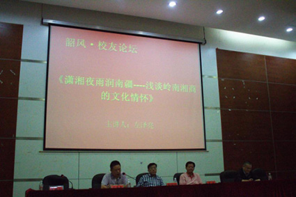 随后,左泽亮先生开始了他“忠于现实和脚下”的讲座,以《潇湘夜雨润南疆——浅谈岭南湘商的文化情怀》为题,生动地讲述了湘商的发展历史以及现状,他提到在商业活动中的水浒精神、井冈山精神。呼吁从商者应有担当、有责任感、还要有百折不挠的精神以及懂得任人唯贤,在时代发展的潮流中,应懂得创新,大胆改革,顺应时代发展趋势。他还作七律诗一首,展现了作为湘商的文化情怀。