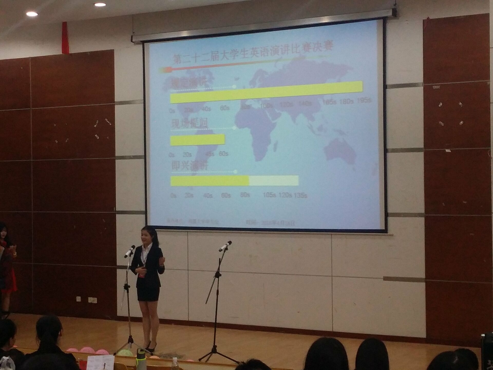此次比赛共分为三个环节:规定演讲、现场提问、即兴演讲。规定演讲的题目为”Life and dream”,选手们以英语演讲的形式,表达着自己对于生活与梦想的理解。每一位选手都是自信地走上舞台来,勇敢地发出自己的声音。他们流畅的口语,标准的发音,赢得了在场每一位观众的肯定。观众们也都全神贯注地听着选手们的演讲,不错过选手们的精彩表现。选手们个个妙语连珠,不仅英语说的好,演讲水平也很好,不紧不慢的语速配合适当的表情手势,给比赛增添了更多精彩看头。