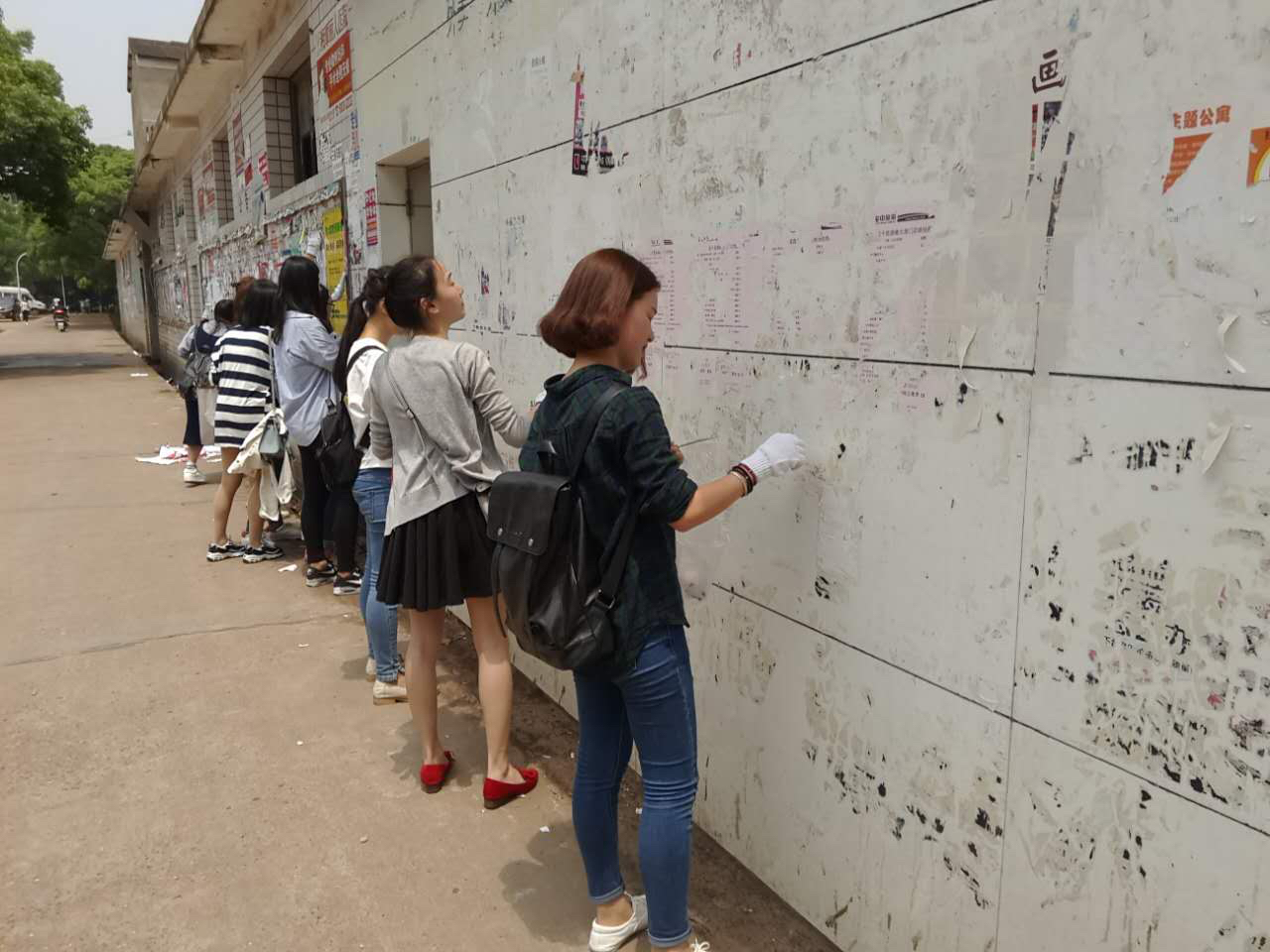 同一时间,北苑新传支部的志愿者也到达集合地点,在王娜的带领下,走向建设银行北苑点的墙边,开始漫长的清理工作。大家互帮互助,先把大面积的广告撕下来,再用小铲仔仔细细的将紧贴在墙上的残余剔除掉,每一个人都十分认真。