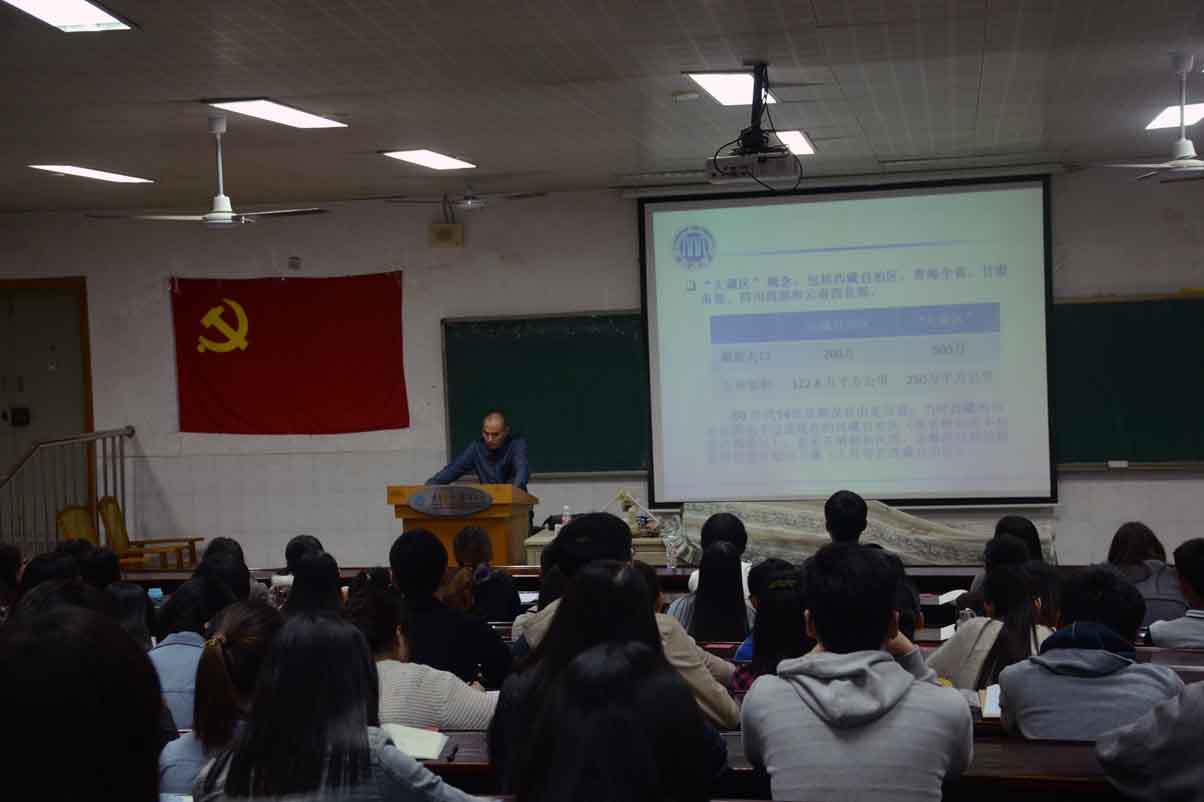 唐春以“中国的国情,党的宗旨”作为授课主题,从中国当前的具体国情出发,从自然资源、人口国情、科技实力三个方面讲述了当前中国的优势所在以及所面临的一系列问题。同时结合当前的“十三五规划”等做了一系列的阐述。唐春具体分析了当前涉及中国安全的几个问题:台湾问题,西藏问题等,并通过一份对台湾民众的调查问卷结果揭示了台湾民众对中国大陆的认同感逐年降低的现状,引发了同学们对当前国家安全问题的思考。