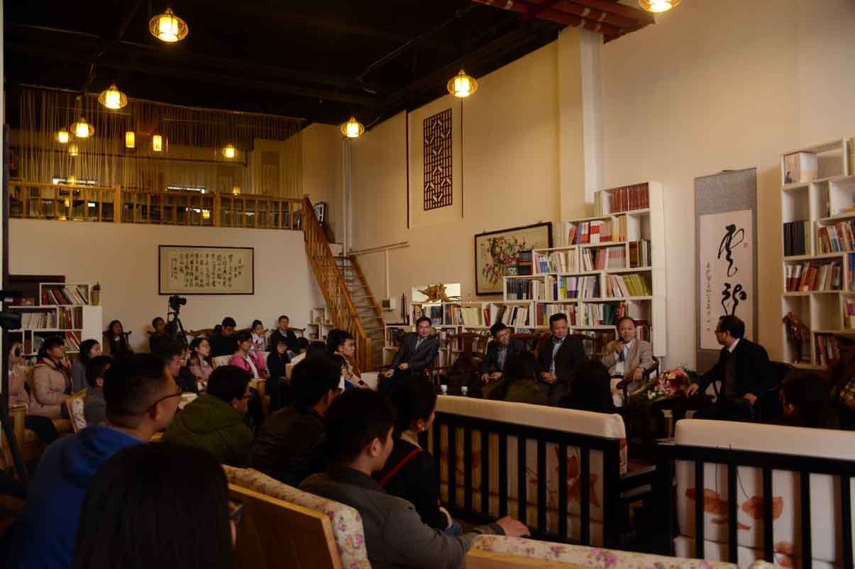 这日天公不作美,但旋梯书苑里仍陆陆续续地来了许多人,一楼容纳不下,又有许多人上到二楼,可见张效雄学长的魅力之大,也展现出湘大学子勤奋好学的一面。讲座开始,周韬首先向我们讲述了他眼中的张效雄学长,并简单地介绍了《风起》一书。随后,刘建平致辞,表达了自己对于张效雄先生到来的欣喜与对张效雄先生的赞赏之情,便将主要的时间留给了张效雄学长。