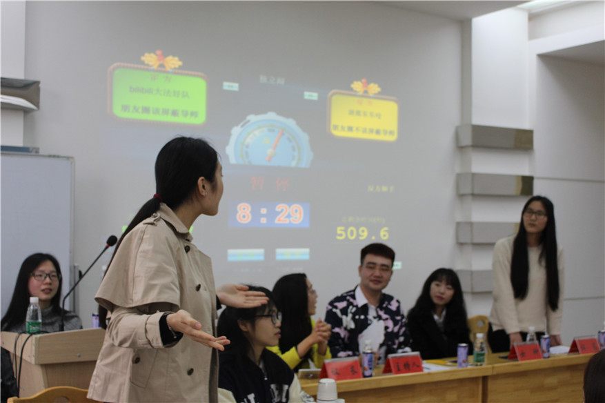 上午九点,比赛正式开始。第一场比赛由BILIBILI大法好担任正方,湖黑东东呛队为反方。他们的辩题是“朋友圈应不应该屏蔽导师?”正方的成员分别是一辩刘桑、二辩彭森、三辩齐琪;反方湖黑东东呛队的成员分别是一辩何丽芬、二辩王琳、三辩朱选民。