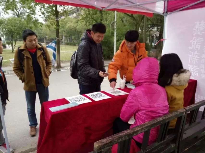开始派票后,不断有同学到摆点处去领取门票。此次领票活动要求同学们先扫取文新院团委官方微信和桃妆小铺的二维码并加以关注,才可以“抱得票归”。另外,还可以获取文艺晚会的主题贴纸及桃妆小铺赞助的小礼品。