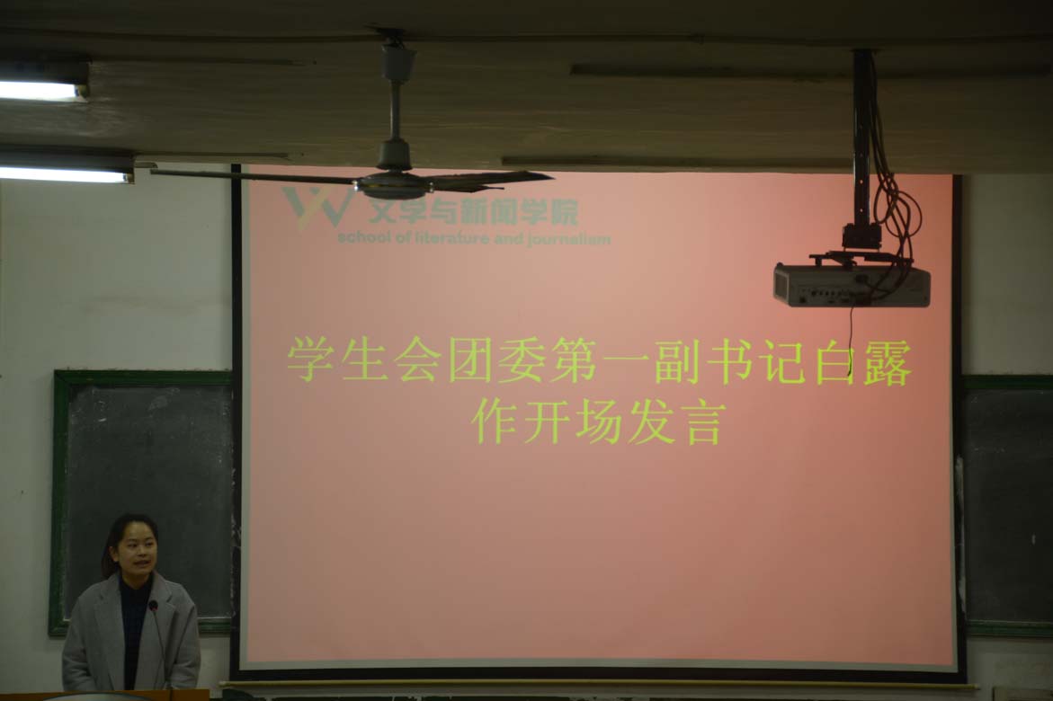 举办的百人大合唱、中华诵、辩论赛、“3+2”篮球赛以及迎新晚会等活动的成功举办表示肯定,进行了简单评价,并提出一些建议。随后,又借“萍水相逢,尽是他乡之客”一语表达了希望大家能摆脱孤独,在组织中实现自我的心愿。最后,她则希望我们能够追求卓越,共同奋斗,坚守情谊,始终保持热情与优秀,越做越好。
