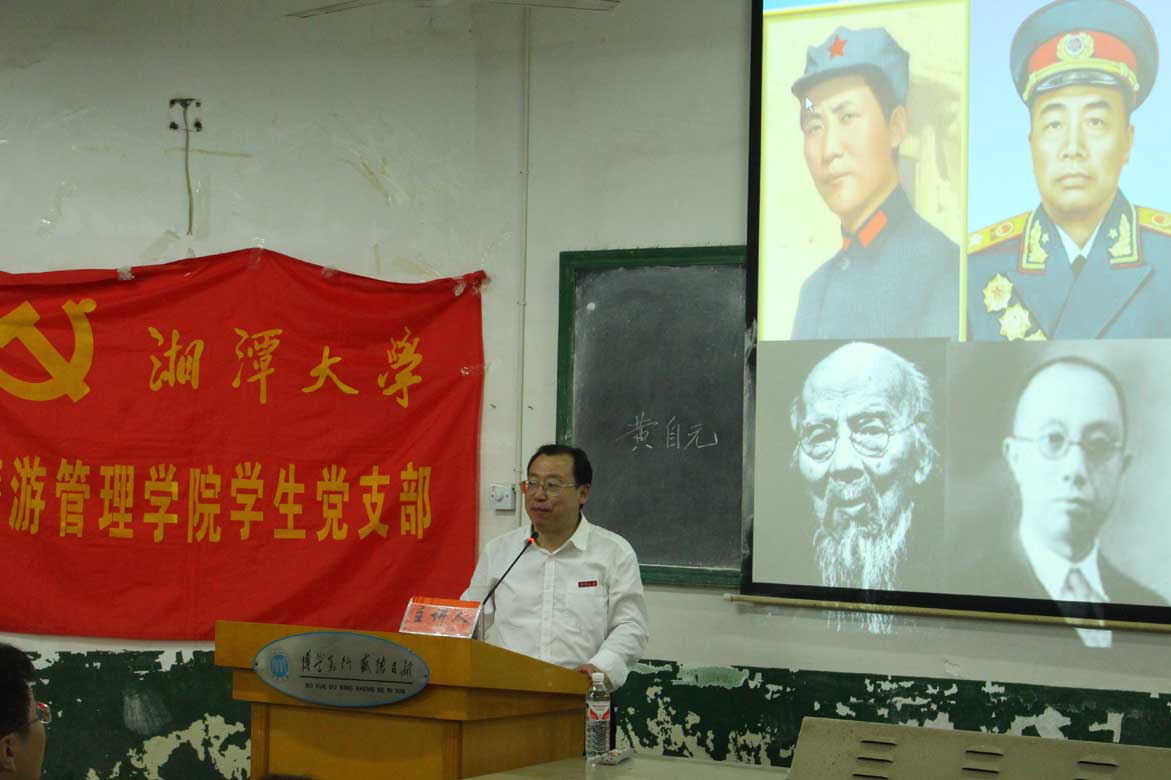 ,旅游管理学院和公共管理学院联办,刘建平副校长担任主讲人。本次党课他主要围绕"湘潭"和"湘大"这两个话题展开,介绍了湘潭的著名人士,讲述了湘大的风光历史。