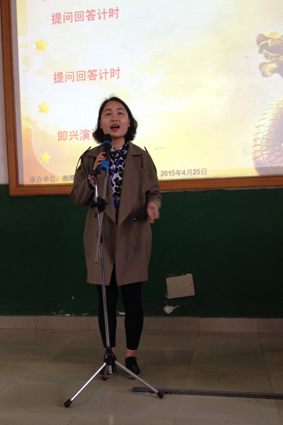 参赛代表王丹作为第三赛场的18号选手出场。她神态自若,娓娓道来。首先他以一位学长因惧怕就业压力而选择考研的事例引出了大学是一座象牙塔的话题。接着,她叙述了自己对于这一说法的质疑与最终肯定,她认为我们都是在梦想着象牙塔之外的生活,但是却在未来来临时选择逃避。她说我们应该勇于尝试和改变,打破象牙塔之窗。最后,她以自己暑假志愿支教的经历,进一步论述了努力改变和挑战自己的重要性,号召大家不要呆在自己想象中的象牙塔和方寸安全之地。在提问环节,她一直提到“Do better”,她希望通过不断尝试改变做得更好。在即兴演讲环节,她围绕“The hero in my eyes”叙述了自己心目中的英雄哈利波特。整个演讲她神情淡然,语调轻柔而富有情感。