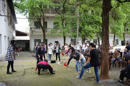 三点整,随着社区的爷爷奶奶们陆续到来与就坐,演出正式开始。本次演出节目丰富多彩,志愿者们仔细的进行了设计与编排:既有《走进新时代》、《国家》、《爱我中华》、《太行山上》......一系列的革命歌曲歌唱祖国,振奋人心;又有《兔子舞》、《可爱颂》、《小苹果》等活泼易学的舞蹈调节氛围,热情洋溢;更有《天仙配》《刘海砍樵》等老人们喜爱的戏曲,引人入胜;还有文娱部的同学倾情献上的柔美舞蹈......台下阵阵掌声,爷爷奶奶们也眉开眼笑。不止如此,志愿者们还设计了一系列轻松活泼的小游戏,如抛绣球,左手右眼等耳熟能详的游戏,简单易学,参与度高,同学们拿着手工制作的道具,邀请台下的爷爷奶奶一起来玩这些游戏,并送上小礼品,社区居民纷纷前来观看,很快场上就热闹起来,社区内回荡着欢声笑语。临近四点,青年志愿者实践部的同学们轻声合唱着部歌——《爱,因为在心中》结束了这场演出。