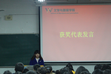 紧接着,学习部部长侯姝作为优秀部门代表、公关部部长王佳慧代表优秀部长先后发言。侯姝坦言学生会成员工作的种种辛苦,台上的精彩背后是每个学生会伙伴的不懈努力。“虽然曾有过抱怨,有过艰难,但我们每个人都将继续努力。”王佳慧也指出了公关部在拉赞助时遇到的问题,以及礼仪培训的辛苦。但她也同样对学生会的未来充满信心。之后,优秀干事青志部湛润发言,她讲述了在学生会的几个月里快乐的经历,对带给她关爱的部长表示感谢;同时,她表达了希望文新院学生会越来越好地为同学服务的美好希冀。