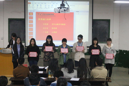 随后,管老师宣布了表彰决定,公布了优秀干事,优秀部长及优秀部门名单。学生会主席吴威为优秀干事进行了颁奖,团委第一副书记洪晓婷为优秀部长、优秀部门进行了颁奖。优秀部门为:宣传部,青年志愿者实践部,办公室,体育部,广告部,心理部。