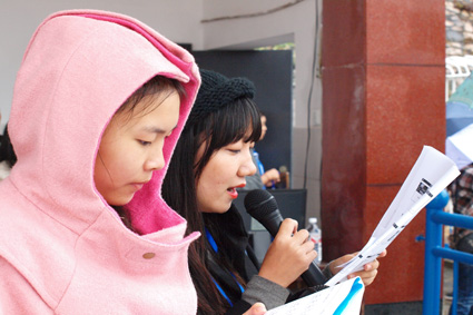 学生,分别是李慧与张弘靖。作为讲解员,她们也说出了自己的特殊感受。由于天气阴沉与人数落差导致场面有些荒凉,但这不会减少她们的热情。李慧与张弘靖也表达了对文新院的希望:希望女生们挑起大梁,强悍上场。两位文新院学生一直认真整理各院来稿,并热情满满地念出,表达对运动健儿们最真挚地祝愿。因为是雨天,她们还给了运动员们温馨提示,希望运动员们把雨中比赛当做另一种挑战与乐趣,赛前充分准备,赛中注意安全。李慧与张弘靖的讲说一直飘荡在第二田径场,为运动会增色不少。