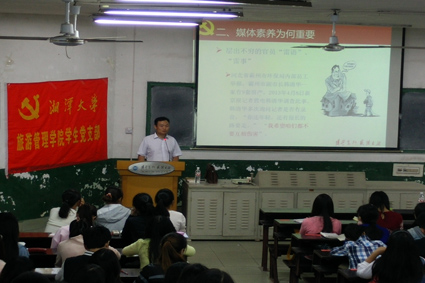 此次授课的主题是《论共产党员的媒介素养》,首先王洁群教授阐述了何谓媒体素养,即用多样方式来获取、分析、评估以及创造信息的能力。然后他以列举近年来官员们的“雷语”、“雷事”来说明媒体素养的重要性。媒体成人亦杀人,当今一些共产党员媒体素养低下,屡出话题,这既不利于个人形象的维持,亦有损党的形象。所以不论是党员,还是当今大学生,都应该以此为鉴,努力提高个人媒体素养。接着,王老师讲解了共产党应具备的媒体素养,他引用习主席关于“推动媒体融合发展要遵循新闻传播规律”的讲话,并说明这既是领导团体对新闻媒体的判断,也是新闻工作的基本要求、共产党员应有的新闻态度。讲好故事,事半功倍,每个人都应该讲好中国故事,传播好中国声音,身为大学生的我们是如此,身为党员更要如此。王洁群教授真情讲述,深刻在理,在座同学亦是受益匪浅。