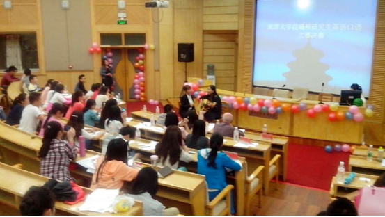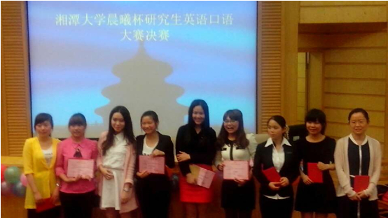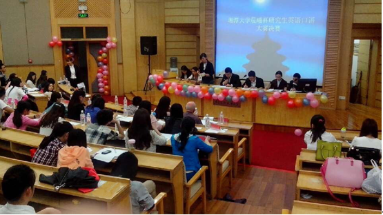 在9日晚上的决赛中我们邀请到王思思老师,肖亮老师以及外教David担任专业评委,并请到嘉宾:外国语学院蒋欣欣副院长,思政干事唐聪老师。同时各院系研究生会干部纷纷到场为自己院的选手加油助威!