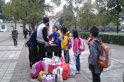 早上7点半,募捐活动正式开始。今天子弟小学的学生上学仿佛多了一个“任务”,因为他们要把自己昨晚精心准备的礼物送给青亭小学与自己同龄的小朋友,希望自己的一份心意可以帮助到他们。募捐物资越堆越多,看着不断堆积的衣服、书本和玩具,还有越来越多的捐款,有一份物品格外引人注目,是一位名叫肖雨嘉的小朋友捐赠的,厚厚的本子外面附了这样一封信:“青亭小学的小朋友们,我叫肖雨嘉,听说你们那有困难,我给你们一些拼音本、20以内加减法练习题、生字本等等。祝你们爸爸妈妈赶快回来。”尽管有些字是用拼音注的,但孩子稚嫩的笔迹让我们感受到那份单纯却真挚的爱心。爱心不分大小,重在心意。