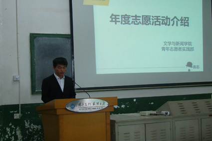 团委学生会青志部部长徐佳超进行了年度志愿活动介绍,详细介绍了四项青年志愿常规活动及志愿者管理制度。