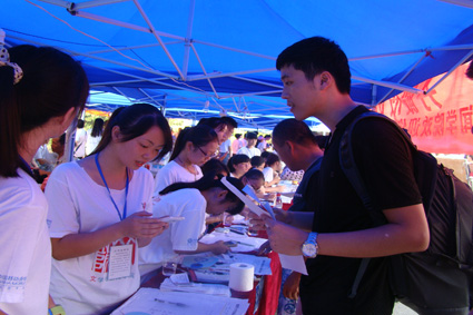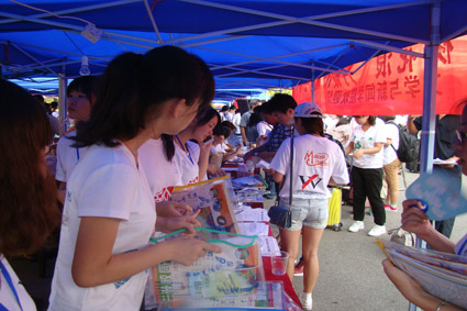 经过昨天一天繁忙的工作,我们的工作人员未显任何疲惫,而是对迎新工作更加熟悉,更好地为每一位新生以及家长进行无微不至的引导、服务。全体人员不畏高温闷热的考验,一直在认真负责地做好本职工作:接待点的工作人员耐心地引导新生登记、签到,联系辅导员;行李组的各位男生穿梭于俱乐部前和北苑、中兴,积极搬运行李,为新生和家长们减轻负担;后勤组的女生们为舟车劳顿的新生和家长递上矿泉水,给炎炎夏日带来一抹凉意;宣传组手握相机、纸笔兼备、发表微博,记录迎新工作的一个个精彩瞬间;机动组更是在方方面面配合其他组,各司其职,大家如同紧密联系的齿轮。