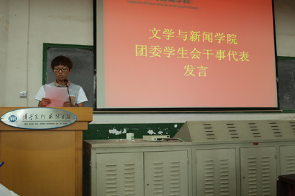 随即,学生会部长代表心理部部长王春露进行发言。作为十三届团委学生会干部代表,王春露部长回顾了曾经的温暖与收获,承诺将服务精神始终如一的传承下去,获得台下同仁的认同和掌声。