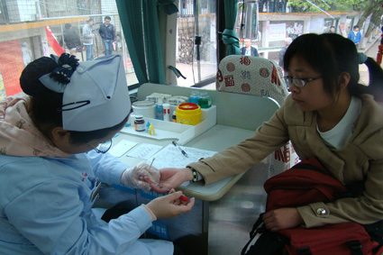 中心血站站长助理胡晓东时,他向记者介绍到,本次采血之后,血源须经过筛选,合格的血源将补充中心血站,以备灾区之需,但不会立刻送往灾区,这需要由国家卫生部及湖南省卫生厅统一调度。同时记者得知,灾区现在对A型、O型和俗称熊猫血的RH阴性血三种血型需求量较大。对于大家比较关心的是献血安全问题,胡晓东介绍到,献血是科学安全的,血站采血采取的是单人、单针、单袋,所有医疗物品均是一次性使用。他最后呼吁,“大学生作为先进代表之一,需要做出更大的表率,踊跃参与。”