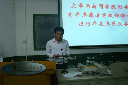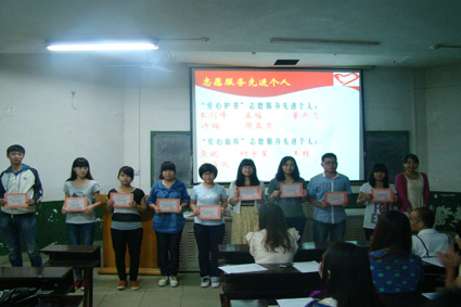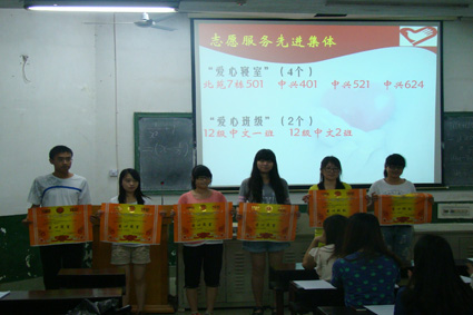 随后,青志部部长徐佳超上台进行年度总结和工作汇报。他对青志部四项常规活动:爱心护书、义务支教、爱心血库及寝室绿色行动进行年度总结,并提到了青志部特色活动,如援建河口镇、湘江之行、志愿服务文化周及关爱自闭症儿童等。他说道:“所有一系列活动离不开志愿者的参加,离不开为志愿服务做奉献的人的参与,因为有志愿者,才有了一个又一个志愿活动,才有了青志部。”在总结完毕后,他宣读了2012-2013学年志愿服务表彰名单。获奖志愿者及志愿集体依次上台领奖。