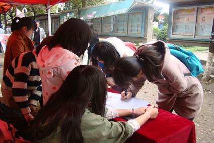 早晨6:30分左右,文新院青志部的干事们就搭建起了临时招募点。7时,就开始有同学陆陆续续地前来报名参加。中午下课后,志愿者招募点顿时人声鼎沸,许多同学在招募名单上写下了自己的名字,并在旁边的海报上贴上了自己的祝福语。在志愿者招募现场,接受采访的徐同学说道:“保护湘江母亲河活动,既体现出了当代大学生素质的全面发展,也体现了我们对整个社会的关心。这不仅仅是一次简单的环保活动,也是一次能够培养大学生社会责任感的活动。”