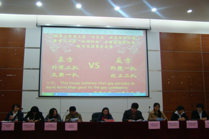 第三届“百灵鸟”杯英语辩论赛暨第十七届“外研社杯”全国英语辩论赛校内选拔赛半决赛正式开赛,本次比赛的辩题为:“This house believes that gay parades do more harm than good to the gay community(同性恋游行对于同性恋团体的发展弊大于利).”