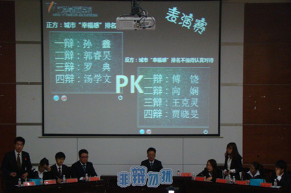 辩论队的8位11级辩手依次登台,为大家呈现了一场精彩绝伦的比赛。正方所持观点为“城市幸福感排名值得认真对待”,开篇立论环节,正方一辩运用富有诗意的话语娓娓道来,并以全国典型城市为例,举出大量数据进行论证。反方一辩则从“调查机构不规范,调查方法不科学,调查样本不合理”三个破题论证“城市幸福感排名不值得认真对待”。在自由辩论环节,双方辩手唇枪舌剑,交替发言,将比赛推向高潮,双方在“幸福感”与“幸福感排名”的区别、调查数据的来源与科学性方面展开激烈辩论,惊人的语速、犀利的言辞使得现场掌声连连爆发。