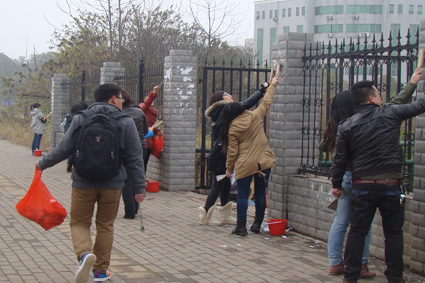金翰林处在繁华商业地段,小广告和垃圾较多,但是志愿者们热情高涨,在领取工具之后,马上开始工作。处理墙上的小广告,要先用水打湿贴纸,再用铁刷子一点一点刷下去,由于天气寒冷,志愿者们握着刷子的手被冻得通红,但大家都很认真地坚持着。在金翰林桥下的沟里,常年堆积着无人清理的垃圾,社区志愿者和文新院的志愿者们一起向“顽疾”发起进攻,最终清理出十多袋垃圾。