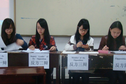 第三赛场比赛,蒋玲玉、洪依璇组合与兴湘二队组成反方,正方由商院一队与外院一队组成。