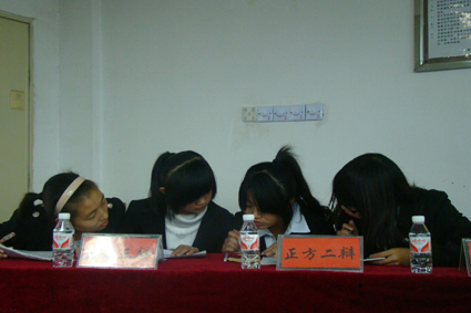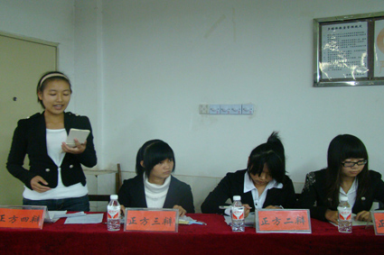 10级辩手李璐、廖慧君和旅游管理学院辩论队队长董文敏。本场比赛正方为12新闻1班,反方为12新闻2班,正反双方争论的的观点为“中学教材应该删减鲁迅作品”还是“中学教材不应该删减鲁迅作品”。最终12新闻1班获得本场比赛的胜利,顺利进入半决赛,其二辩李莹莹荣获“优秀辩手”称号。