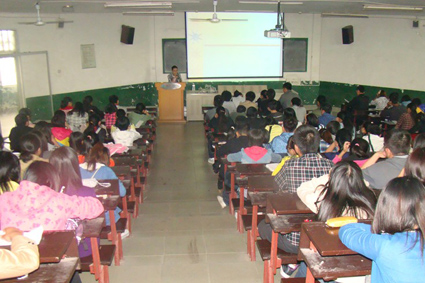 接着,沈照宇给同学们出了一道特别的题目:假设字母A代表1%,B代表2%,C代表3%,依次类推到Z,有没有哪个单词的字母正好加起来是100%呢?在同学们的疑惑声中他揭晓了答案,那个单词就是attitude(态度)。他指出,态度在大学生活中有举足轻重的作用,要想把握好大学时光,就要有三种态度:首先是“知足”,大学中竞争很激烈,我们在竞争中难免会遇到困难挫折甚至失败,这时就需要知足的态度,要学会调整自己;其次是“知不足”,人贵有自知之明,身边有许多值得学习的人或事,要善于学习,取长补短;最后是“不知足”,在对待学习和工作时,要有不知足的态度,锐意进取,这一条看似与第一条相悖,但世上没有绝对的知足和不知足,关键是自己把握。授课的最后,沈照宇鼓励学员们:“朝着自己的目标去奋斗,找到自己的一片天。”他的话语赢得了在场同学热烈的掌声。