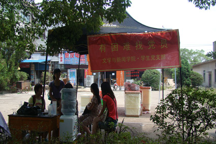 党员义务岗设有供水点,烈日炎炎,往来的新生、家长以及迎新工作者们都可以在此作短暂休息;同时,党员义务岗也是咨询站,工作人员可以为新生提供入学指导,解答新生疑惑;此外,党员义务岗是北苑的行李中转站,哔咔漫画