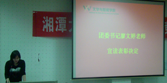 大会开始,团委书记廖文婷老师宣读了关于优秀干事、优秀部长和优秀部门的表彰决定,并进行颁奖。之后,唐春副书记进行讲话,他首先就第十一届团委学生会所有成员一年的工作和所取得的成绩表示了感谢,并提出,在文新院团委学生会,能力与责任心相比永远是第二位的,希望新任的主席团和部长们能够利用学生会这个平台锻炼自己各方面的能力。