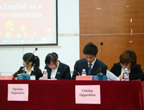 本场辩论赛的辩题为“China should abolish English as a compulsory subject in higher education”(中国应该取消英语作为高等教育中的必修课),文新院一队,二队分别为正方一二辩,反方三四辩,又成对打之势。双方辩手口语流利。举止风度十足,论点条理清晰,掷地有声。