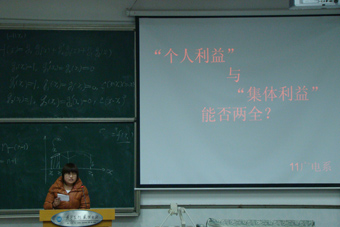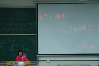 在本次团课中,主持人首先播放了五组时事热点的PPT,每一时事热点后都附加了一个话题,各系根据指定话题进行十五分钟讨论。其中,11中文系的话题是如何处理“理想”与“现实”的关系;11新闻系的话题是对于有损公德的行为,“教化”更重要还是“惩罚禁止”更重要;11广告系的是为了个人利益,有限制地伤害动物可取吗;11广电系的是“个人利益”与“集体利益”能否两全;而10级的话题是是否应当提倡“见义勇为”。